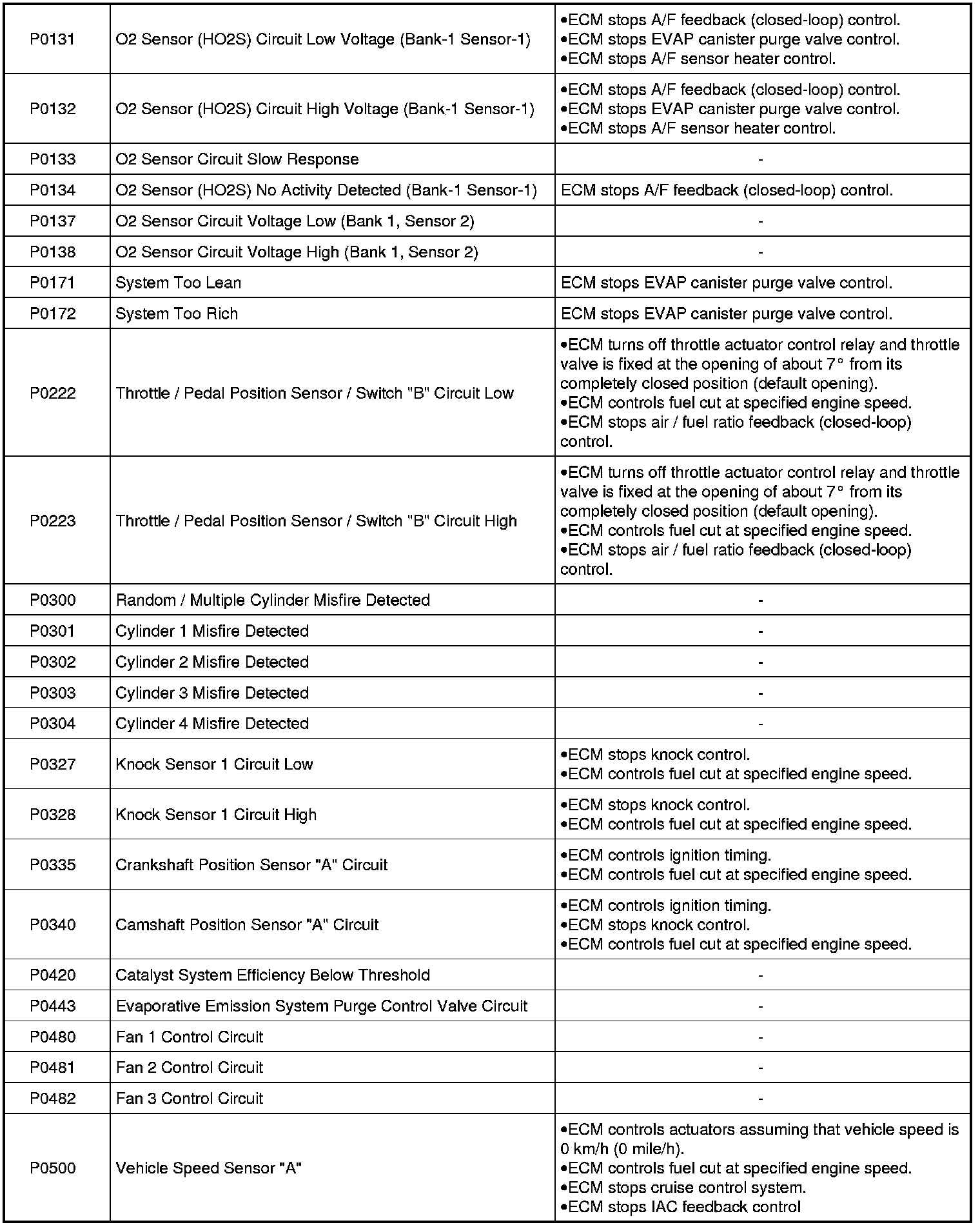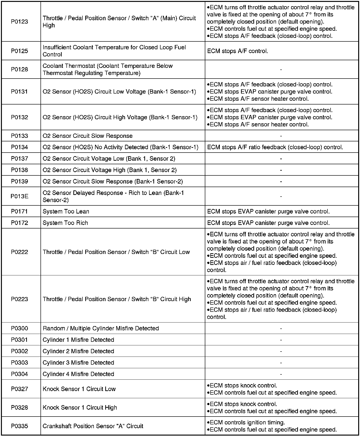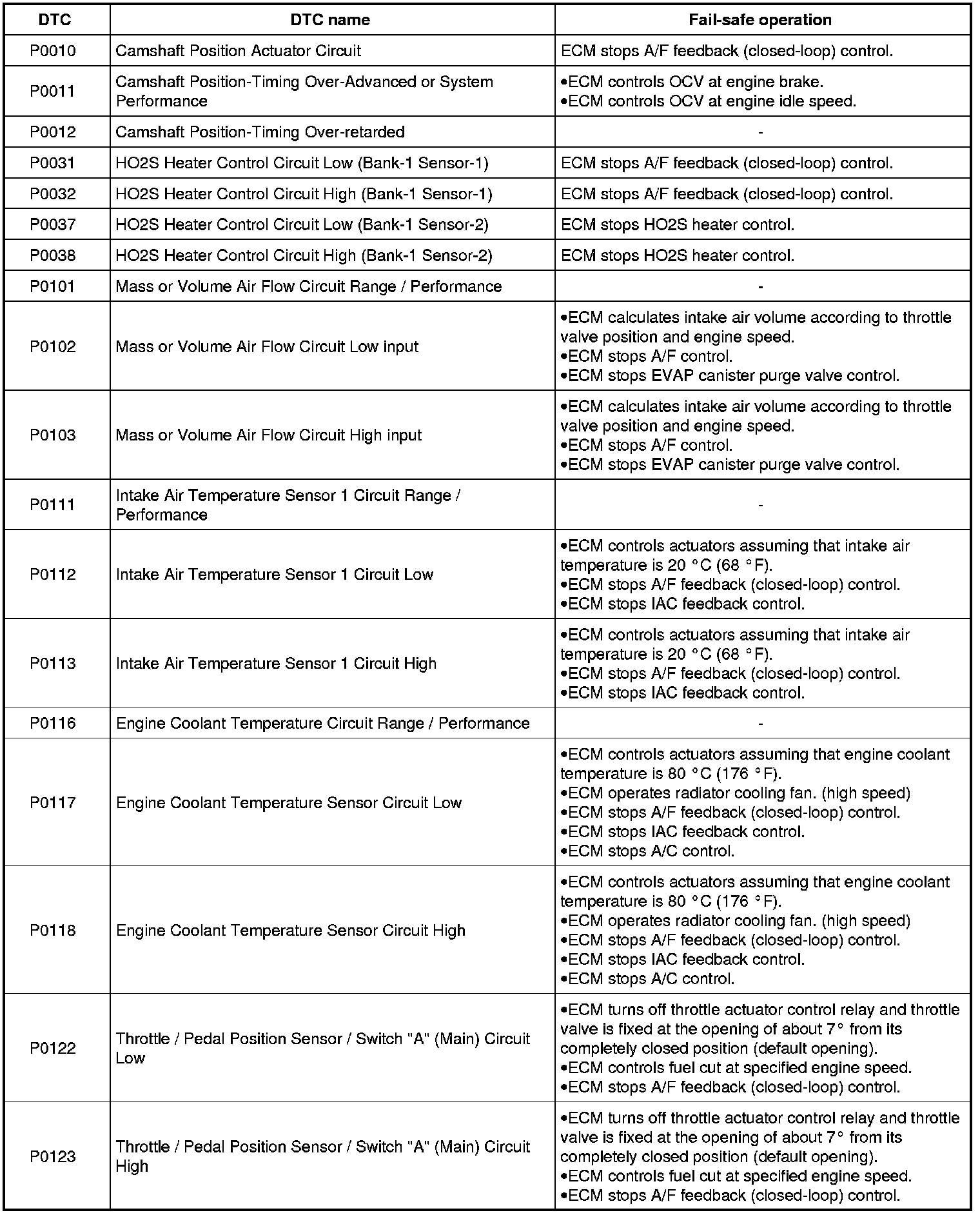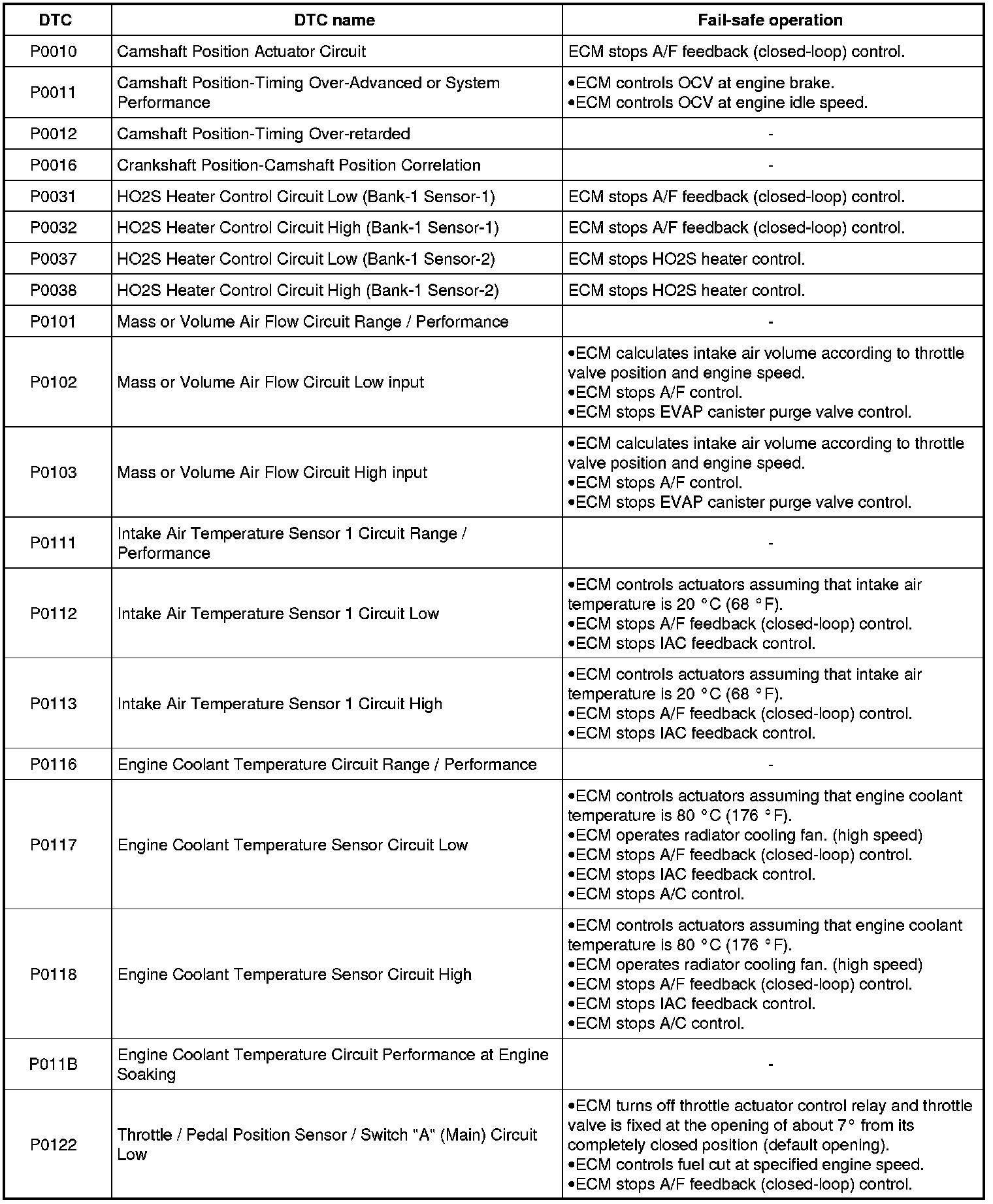 When any of the following DTCs is detected, ECM enters fail-safe mode as long as malfunction continues to exist but that mode is canceled when ECM detects normal condition.
