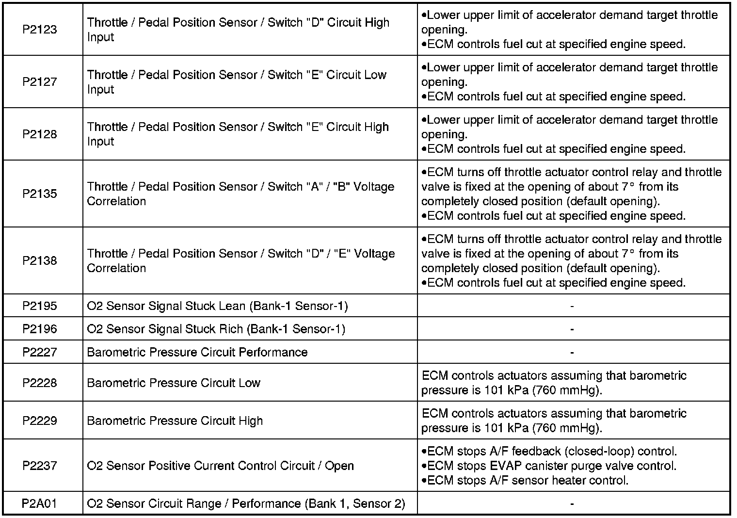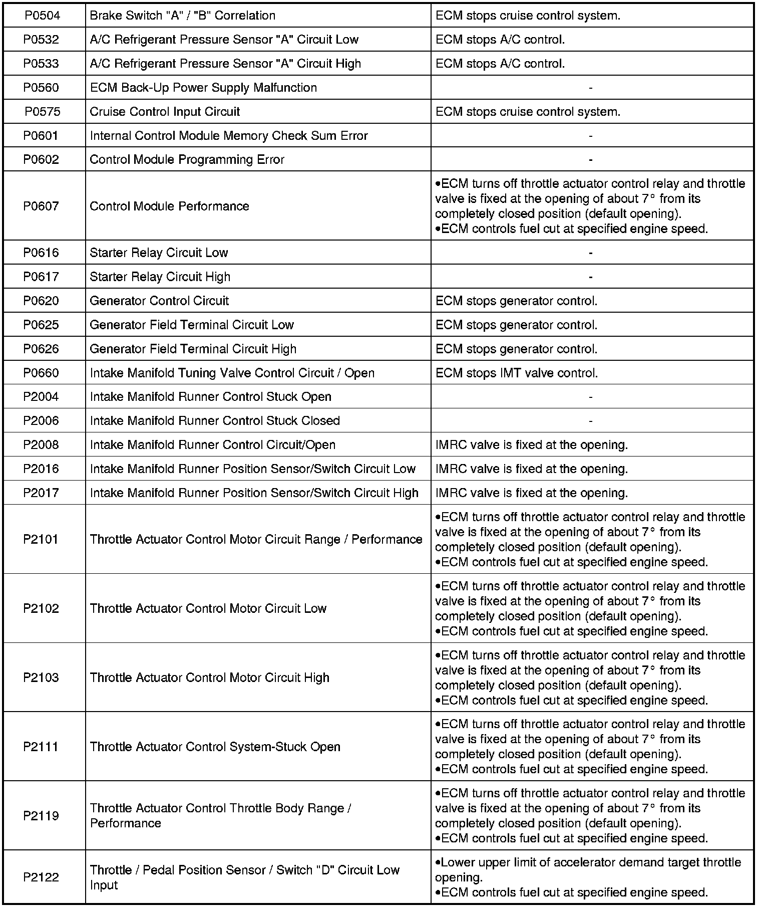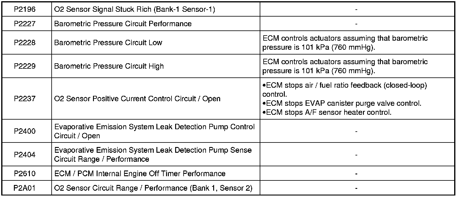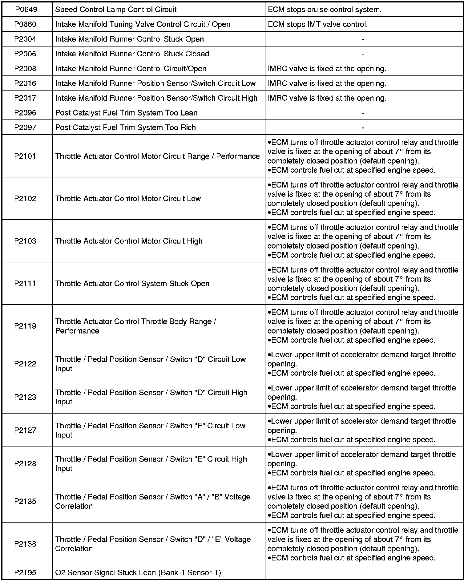 When any of the following DTCs is detected, ECM enters fail-safe mode as long as malfunction continues to exist but that mode is canceled when ECM detects normal condition.