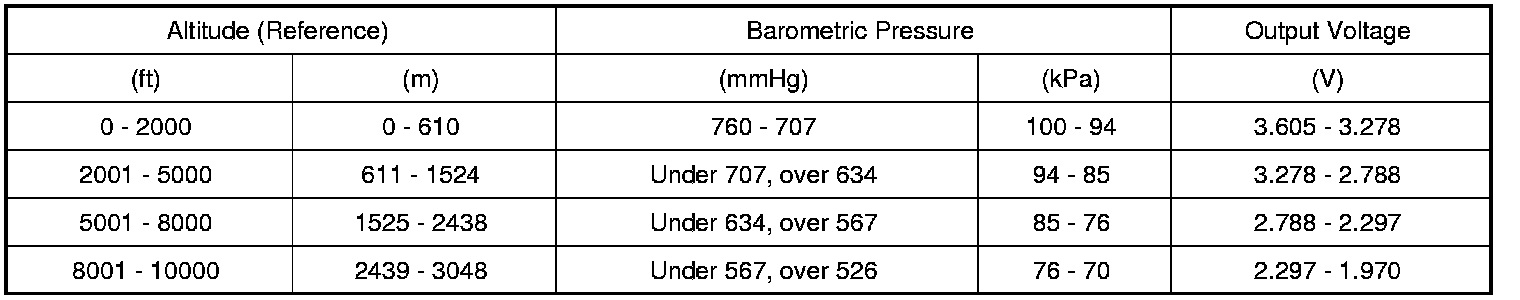EVAP leak check pressure sensor output voltage for initial (barometric) pressure (Terminal "4" voltage 4.5 - 5.5 V at ambient temperature of 20 - 30 °C (68 - 86 °F))
