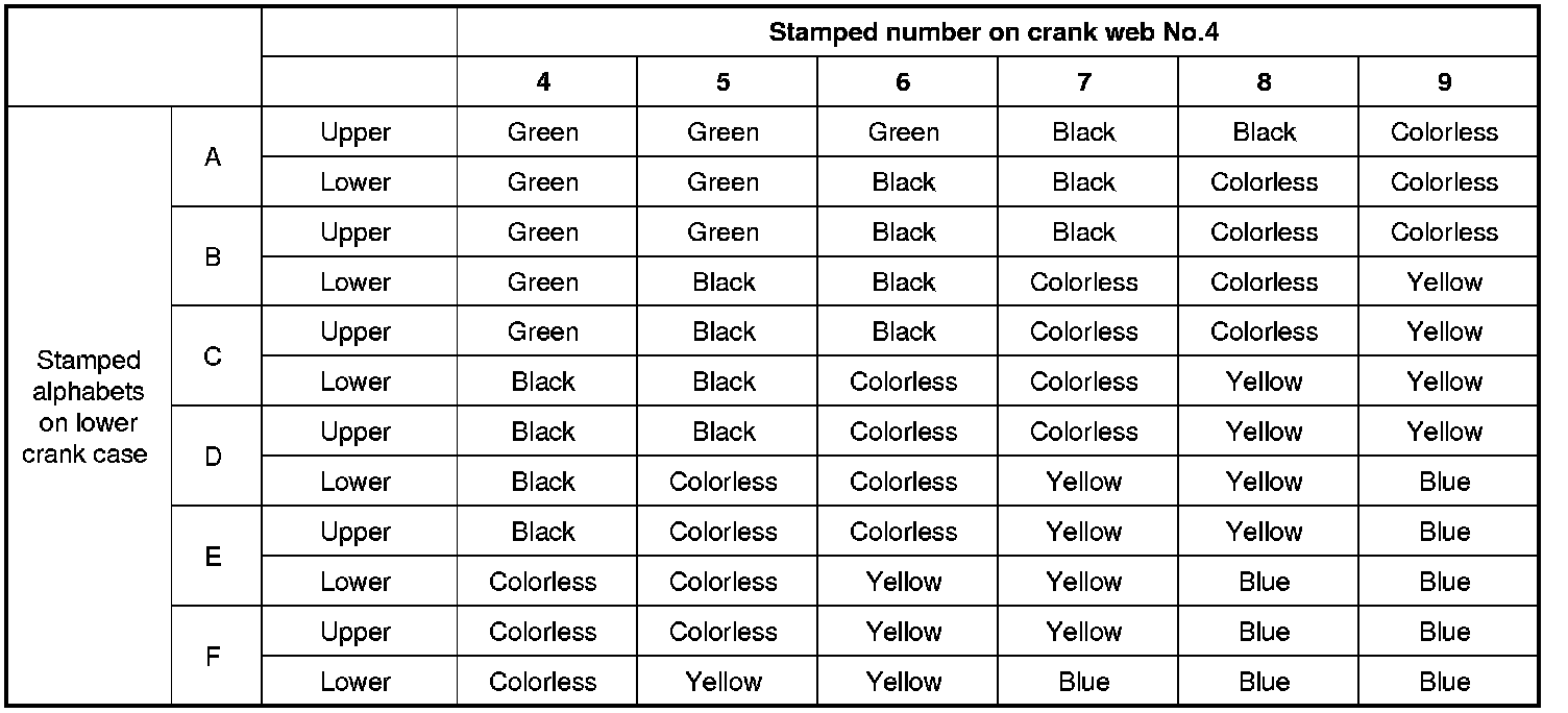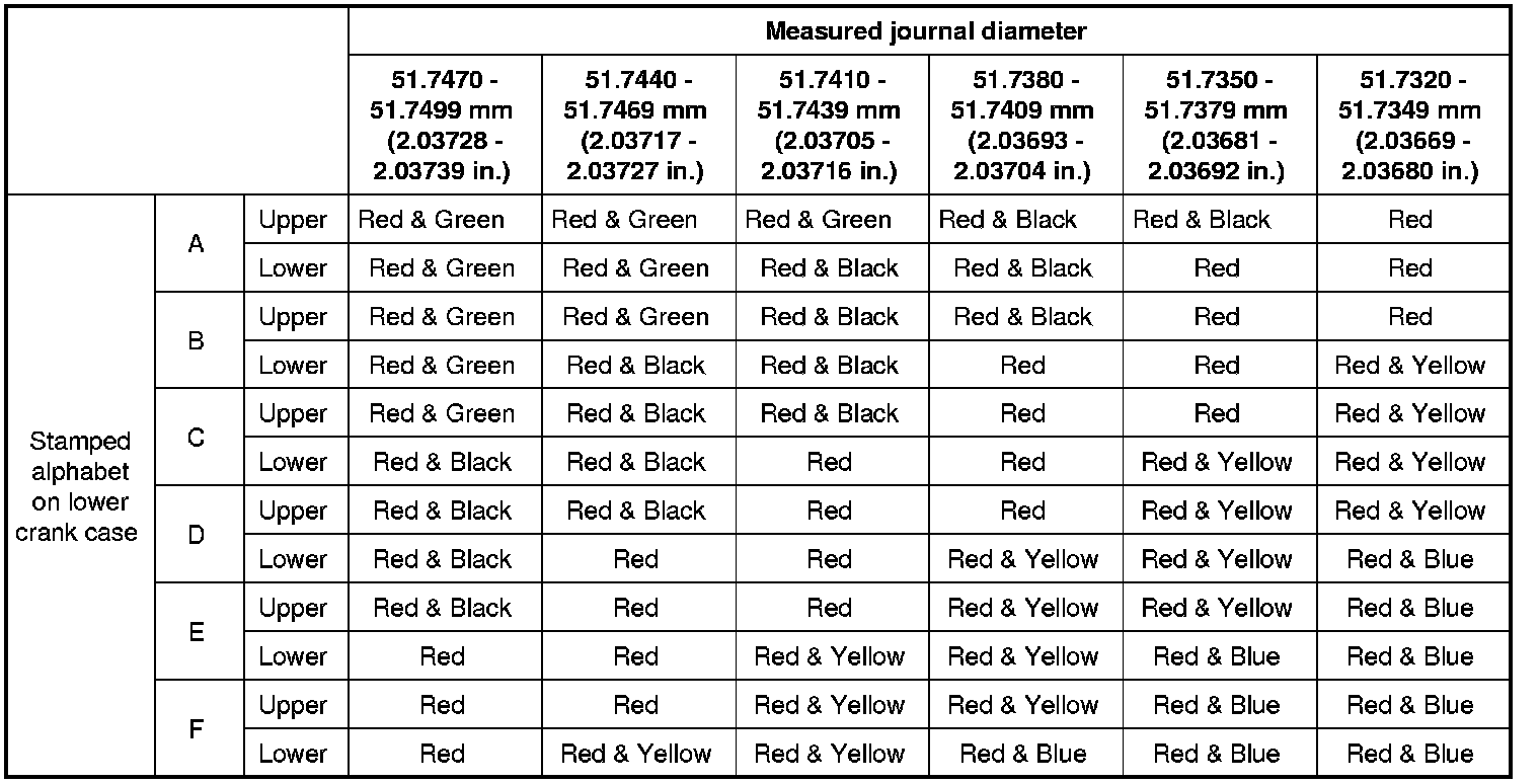 Main bearing cross - reference table (under size)