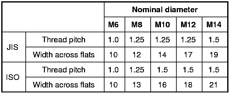 It is important to note that, even when the nominal diameter (1) of the threads is the same, JIS-defined and ISO-defined fasteners may be different in thread pitch (2) or width across flats (3). Refer to the JIS-to-ISO Main Fasteners Comparison Table below for these differences. Before installing a fastener, check it for correct thread pitch and then, screw it in or on the mating fastener by hand. If the fastener is too tight to turn by hand, its thread pitch may be different from that of the mating fastener.