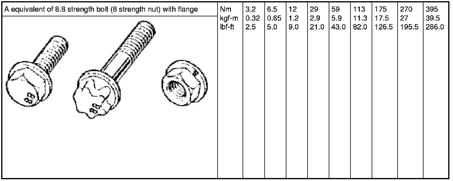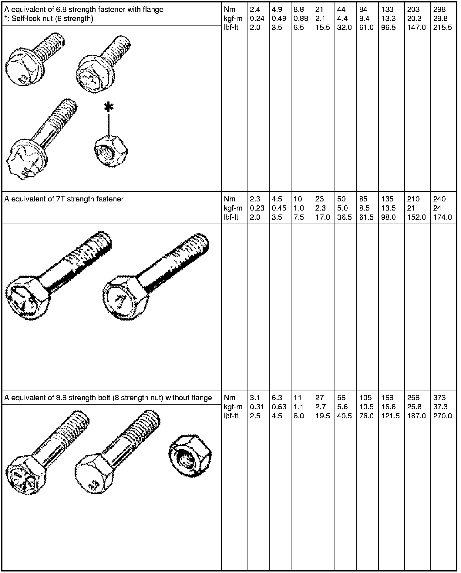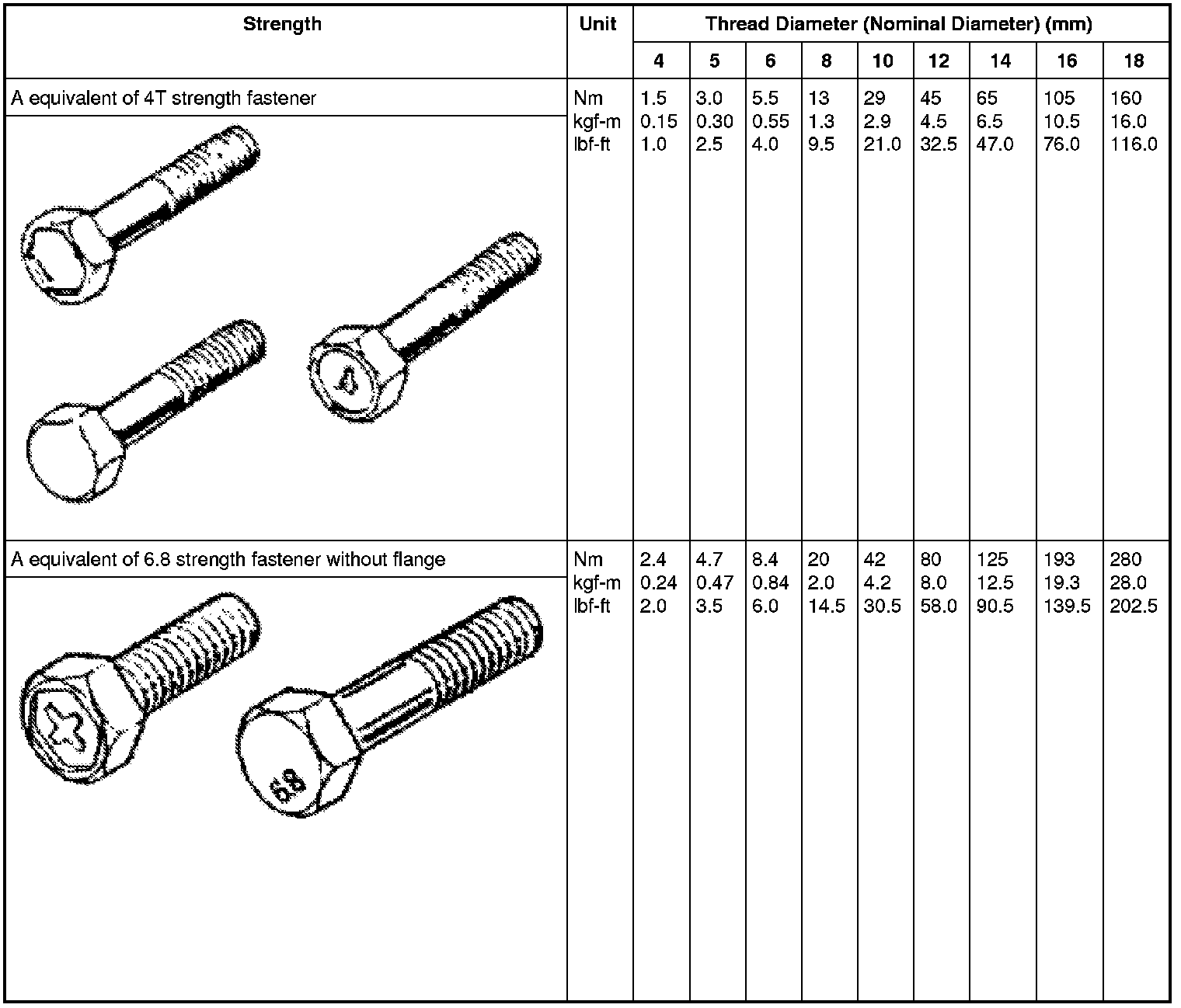 Each fastener should be tightened to the torque specified in each section of this manual. If no description or specification is provided, refer to the following tightening torque chart for the applicable torque for each fastener. When a fastener of greater strength than the original one is used, however, use the torque specified for the original fastener.