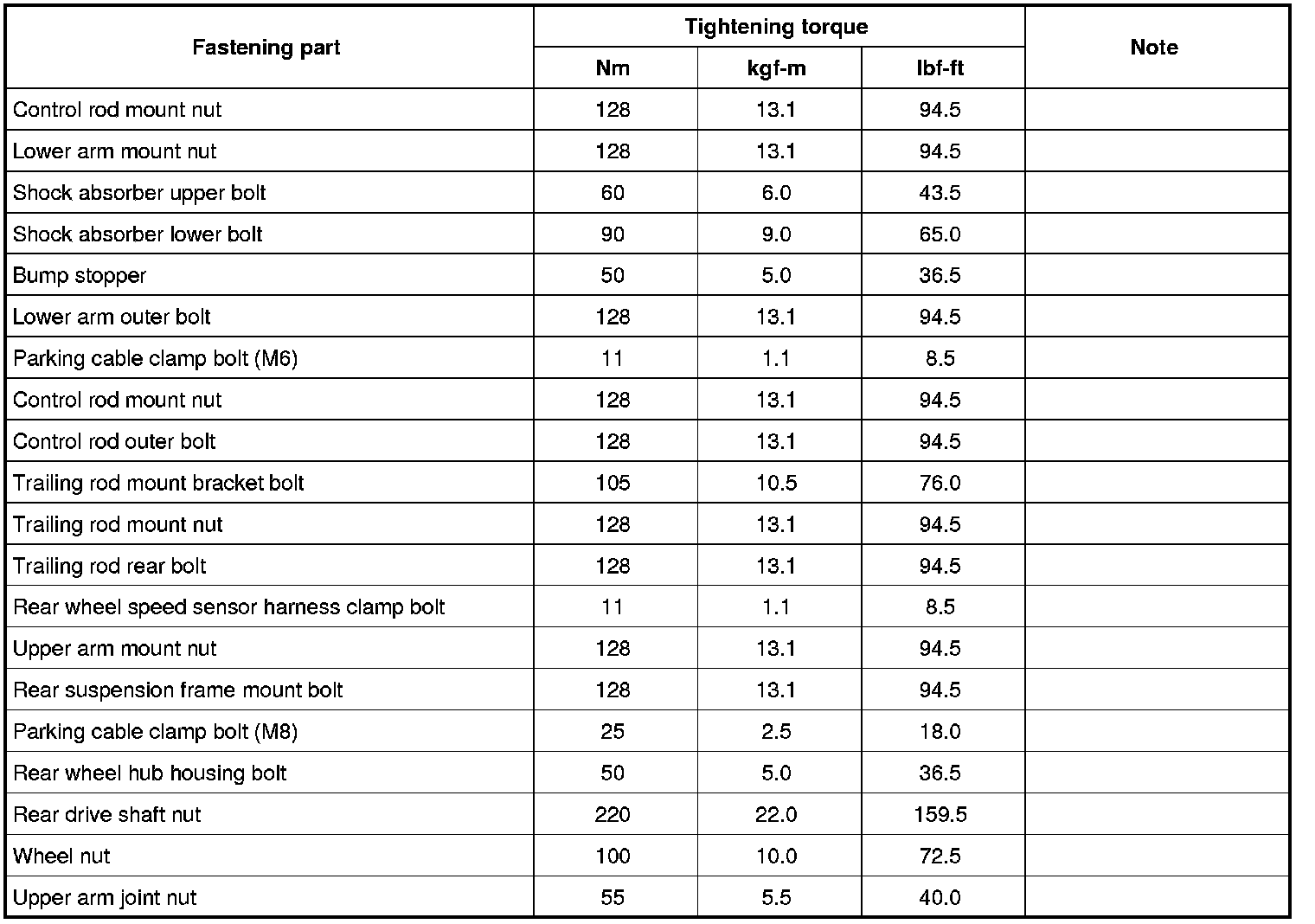 Tightening Torque Specifications