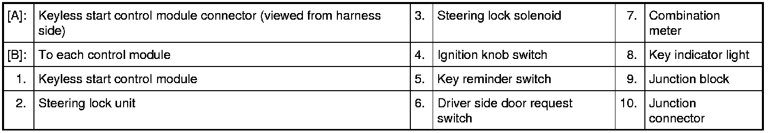 The keyless start control module detects DTC by using signals from the key reminder and driver side door request switches. The keyless start control module makes the key indicator light in the combination meter flash on and off by using CAN communication.