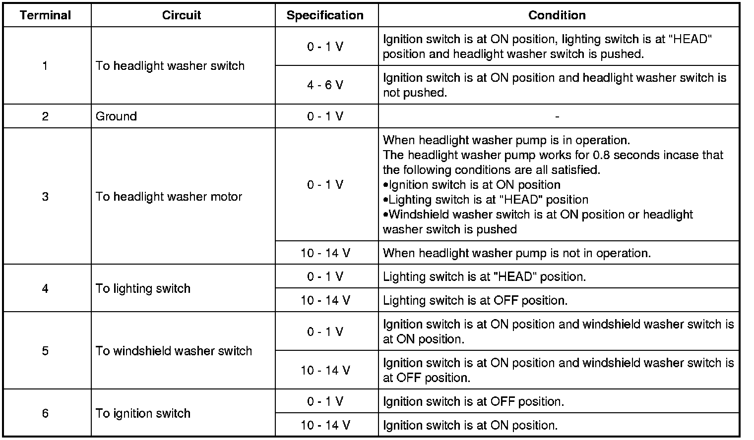 If measuring voltage is not within specification, first check related switch and applicable wire harness circuit for open or short. And if all wire harness circuits and connections are normal, replace headlight washer control module.