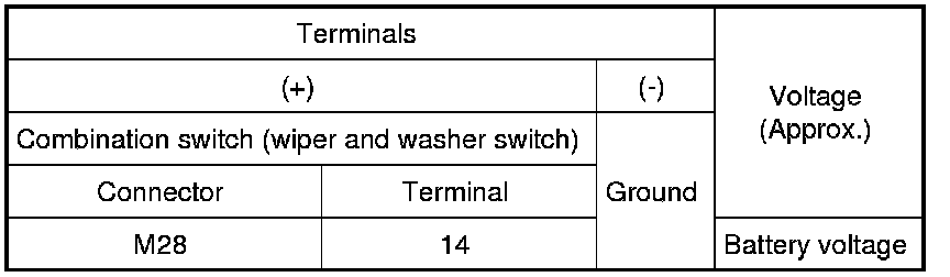 3 Check voltage between combination switch (wiper and washer switch) harness connector and ground.