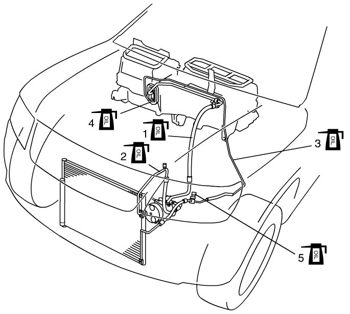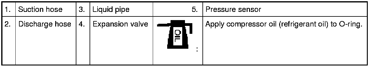 - When connecting hoses and pipes, apply a few drops of compressor oil (refrigerant oil) to seats of coupling nuts and O-ring.