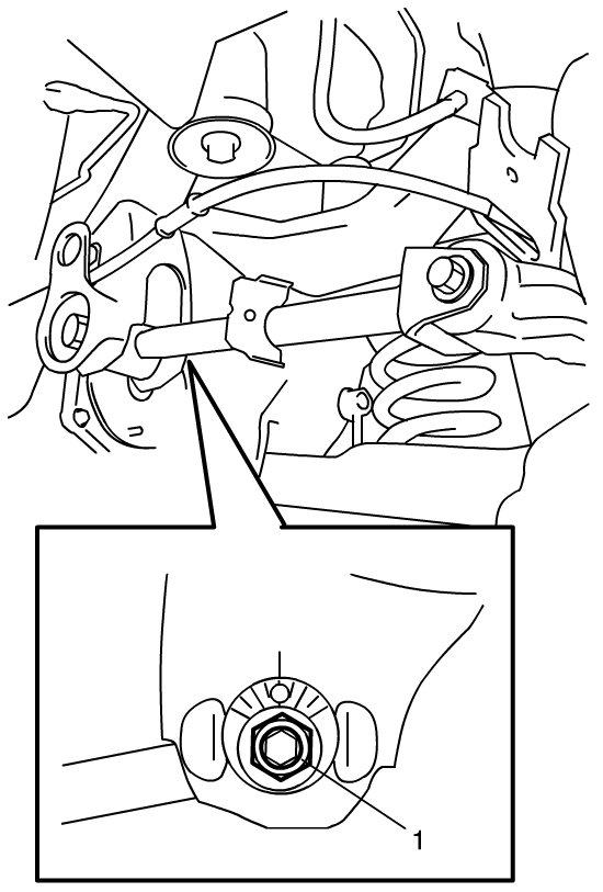 2) Adjust toe and camber to satisfy the specification by turning right and left control rod inner bolts (cam bolts) (1) with the same amount.