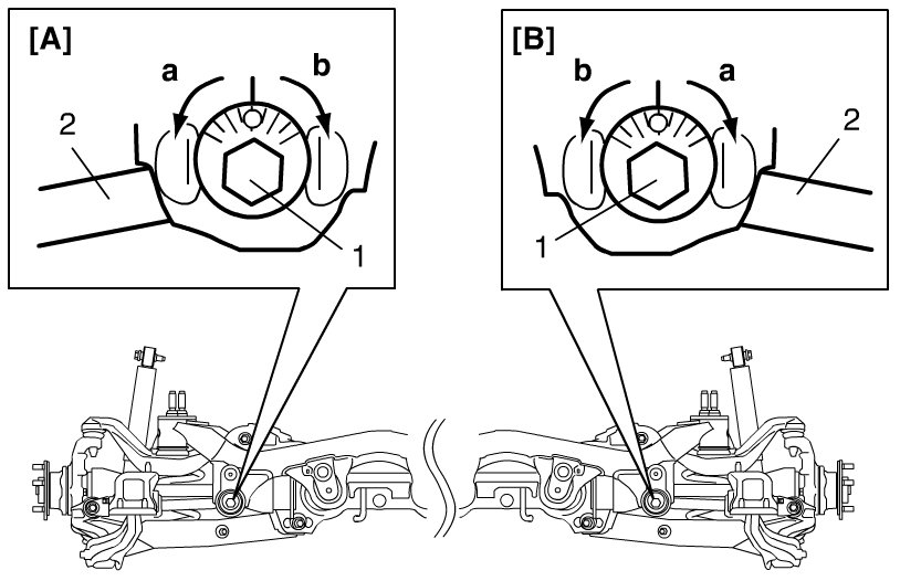 When bolt is turned a-direction, camber becomes "+" and toe becomes "IN". When bolt is turned b-direction, camber becomes "-" and toe becomes "OUT".