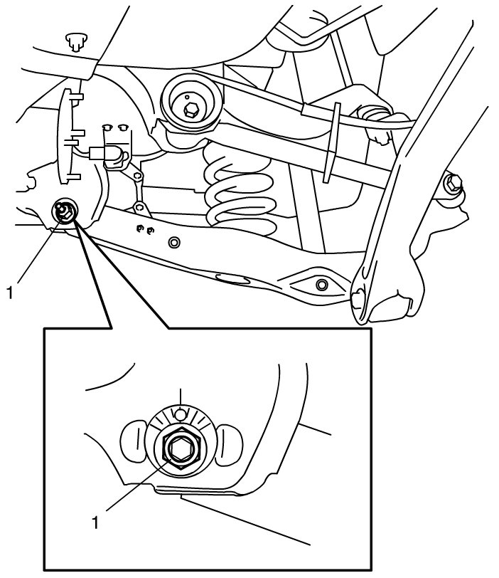 5) Adjust toe and camber to satisfy the specification by turning right and left lower arm inner bolts (cam bolts) (1) with same amount.