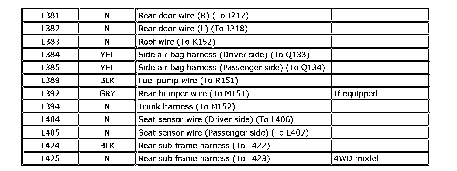 L: Floor Harness, Rear Sub Frame Harness / Q: Side Air Bag Harness / R: Fuel Pump Wire