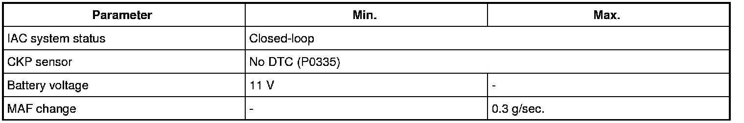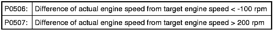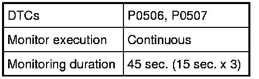 The IAC is checked throttle valve opening by monitoring the closed-loop idle speed comparing with the desired idle rpm. If the idle rpm is higher than the desired idle rpm by 200 rpm or lower than the desired idle rpm by 100 rpm, an IAC malfunction is detected. (P0507, P0506)