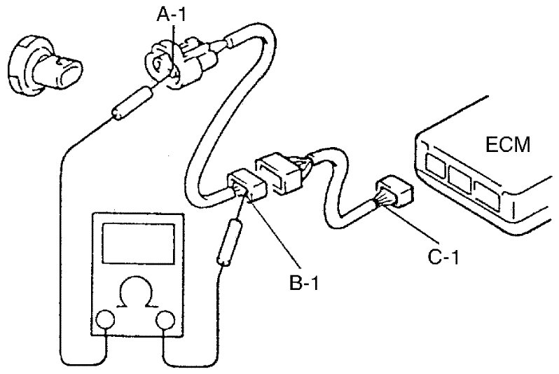 If no continuity is indicated, that means that the circuit is open between terminals "A-1" and "B-1". If continuity is indicated, there is an open circuit between terminals "B-1" and "C-1" or connector-B is defective.
