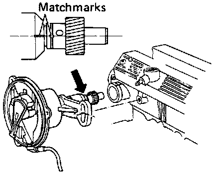 5. Align the matchmark of the distributor (drillmark on the spiral gear) with that of the distributor housing as shown.