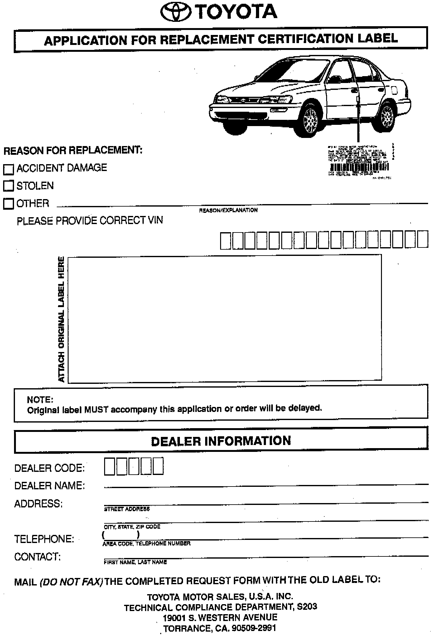 ^ A new label MAY NOT be available if the vehicle is more than five years old and the old label does not accompany this request.