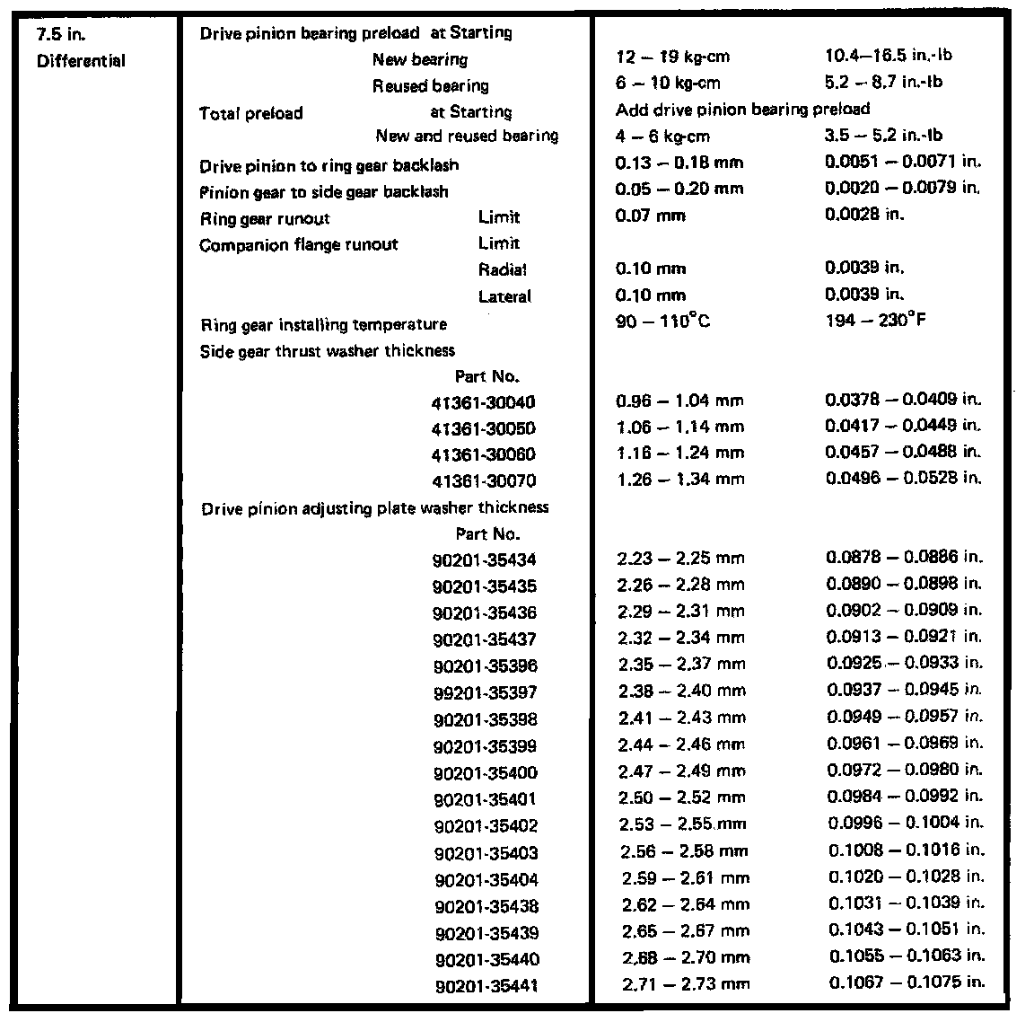7.5 Inch Differential, Drive Pinion Clearances/Tolerances: