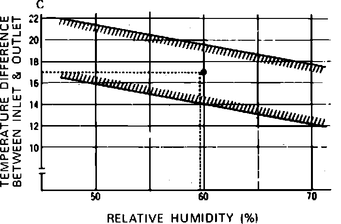 8. Using relative humidity and difference between air inlet and air outlet temperatures, determine if system is working satisfactorily by using chart in Fig. 8. Example given shows a relative humidity (step 6) of 60% and a difference in temperature of 17 deg. C. The points intersect within lines on graph, so system is satisfactory.