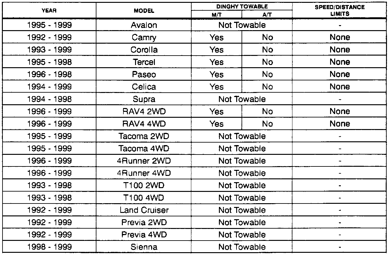 The following chart indicates which Toyota vehicles can be Dinghy towed (towed with four wheels on the ground) behind a Motorhome.