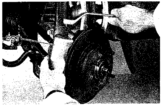 6. Suspend the brake caliper with wire. Do NOT disconnect the brake line.