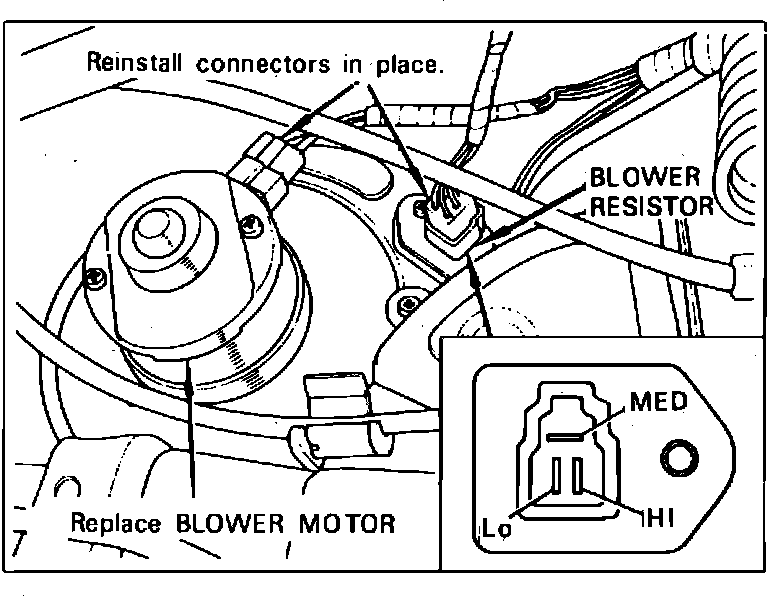 3. Measure resistance of blower resistor. Resistance should be .5 ohm between MED and HI and 1.1 ohms between MED and LO. Replace resistor if defective.