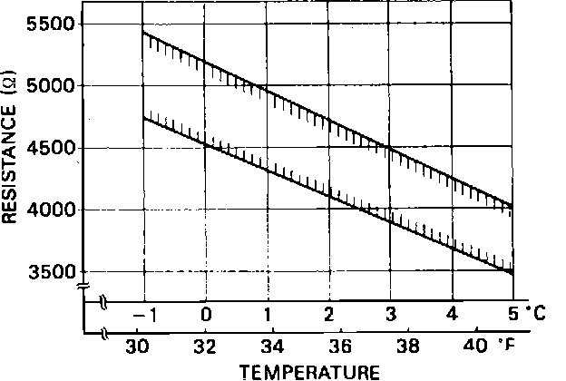 5. If thermistor resistance does not increase within ranges shown in chart, Fig. 18, thermistor is defective. Intersection point of water temperature and measured thermistor resistance should fall between lines on graph, Fig. 18.