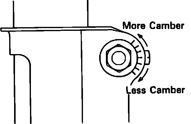 Camber is adjusted by turning the camber nut located on the front strut, Fig. 1. Measure camber with suitable alignment equipment, then adjust camber by loosening shock absorber set nut and turning cam as necessary to bring camber within specification. Retorque set nut to 166 ft. lbs. on 1987-88 Camry, 152 ft. lbs. on 1985 Corolla FWD with diesel engine, 1985-86 Camry and 1986-88 Celica or 105 ft. lbs. on all other models.
