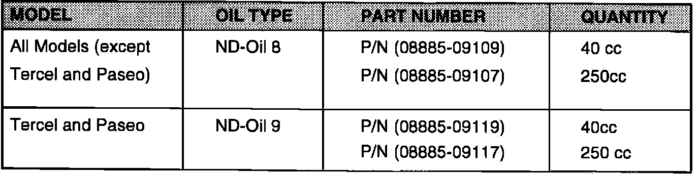 Use only the recommended oil for Tercel/Paseo thru-vane type compressors in order to prevent the possibility of compressor failure.