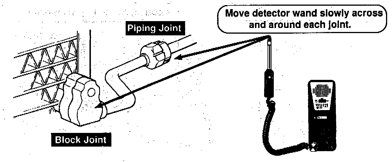 A. Checking for leakage at block and piping joints: Wipe the oil/dirt accumulation off the joints with a clean rag. Do not use solvents to clean the joints. Refrigerant is heavier than air so start checking for leaks with the detector wand about 1/4 inch below the joint. Move the wand slowly across and around each joint (see illustration below).