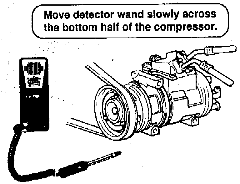 C. Checking for leakage at front compressor seal: Front compressor seal leaks are probably the most difficult leaks to detect accurately. Special diagnostic procedures must be followed for the best success. Make sure the system is fully charged. Operate the system with a pressure gauge installed and assure that the system has correct system pressures. Shut off the engine. Begin the leak check by placing the detector probe along the bottom half of the compressor clutch. Move the wand slowly across the bottom of the compressor clutch. Be careful not to expose the detector wand tip to any oil residue as this may cause a false leakage reading (see illustration).