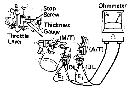 2. Insert a 0.75mm (0.0295 in) thickness gauge between the throttle stop screw and lever then conect the ohmmeter to terminals IDL and E1.