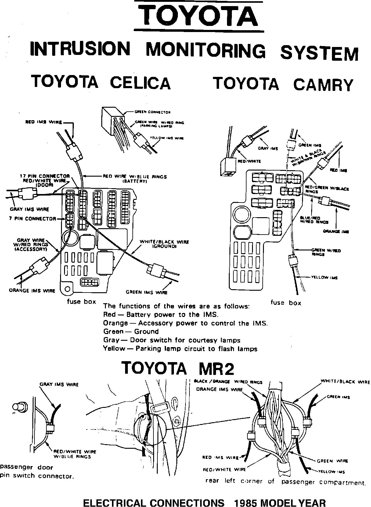 Attached for your information on the reverse side of this bulletin are three IMS electrical connection diagrams. These are for the 1985 MR2, Celica and Camry models. As a normal trouble-shooting procedure, always use the IMS tester, OTC P/N 00203-00861. If all the function checks on the tester prove positive, the electrical connections to the module are correct. Please refer to the procedures included with the IMS tester and to Toyota Service Bulletin Number 002, Accessories Section, for additional trouble-shooting information.