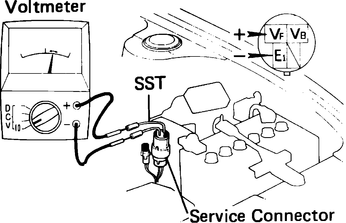 1. Run engine until it reaches normal operating temperature, then connect voltmeter to EFI service connector as shown in Fig 41.