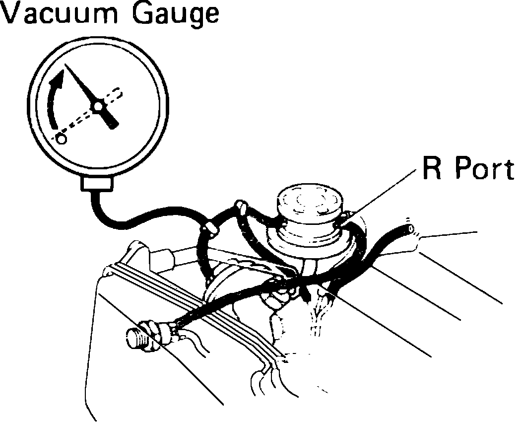 7. Disconnect vacuum hose from port ``R'' of vacuum modulator, Fig. 33, and connect manifold vacuum directly to port ``R.'' Vacuum gauge should now indicate high vacuum at 3500 RPM.