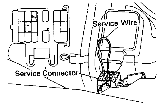 1. Connect timing light to engine.2. Short terminals T and E1 of the service connector, which is located next to the air flow meter, as shown.