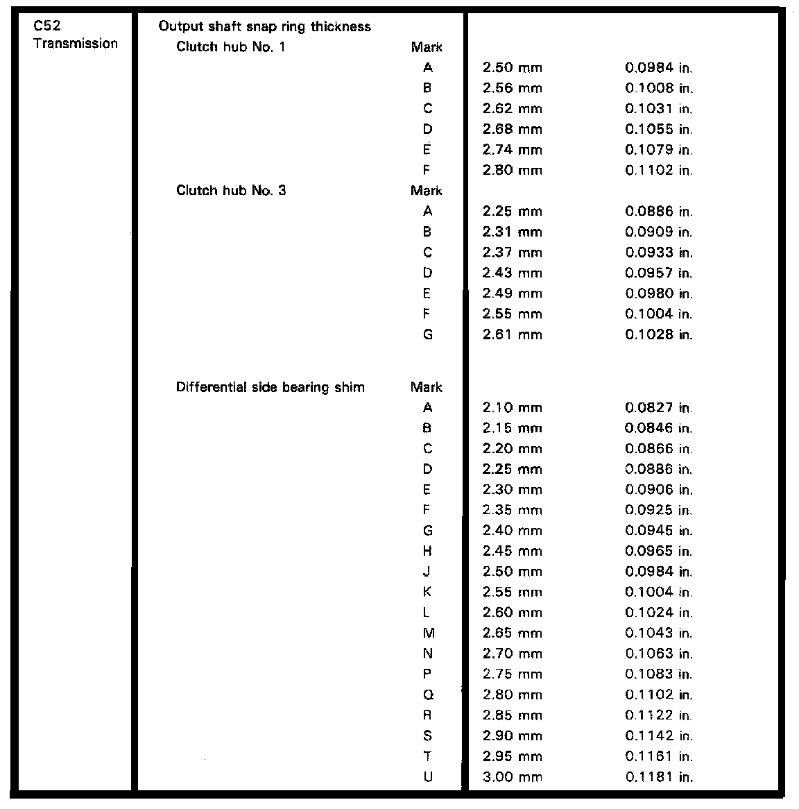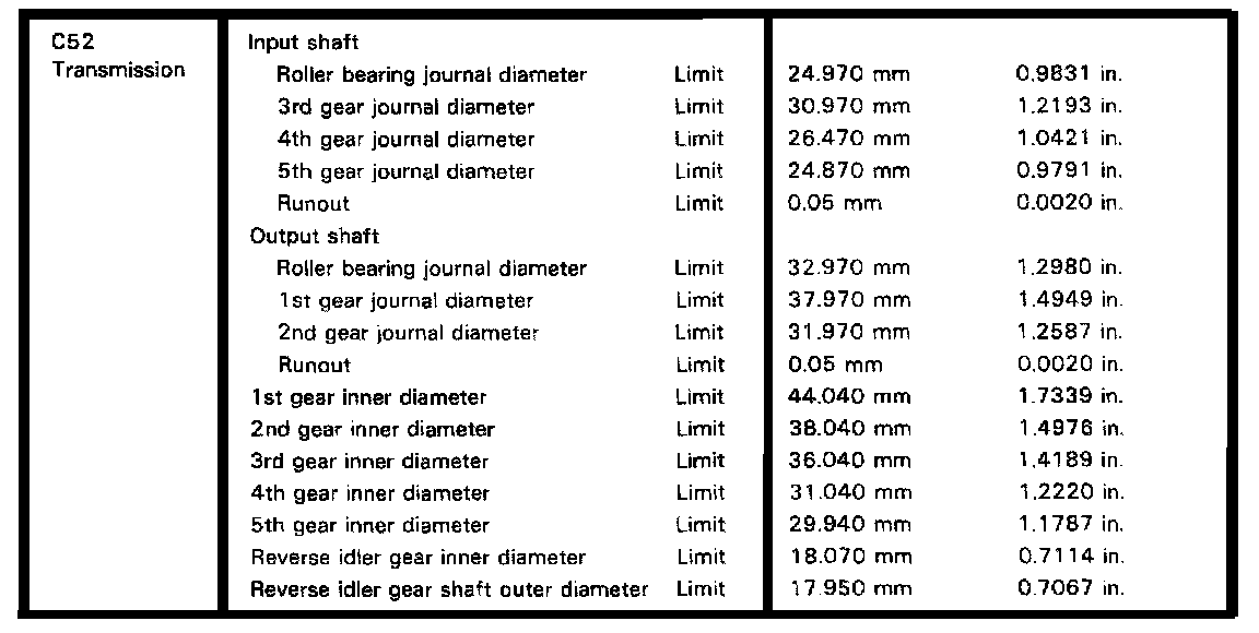 C52 5-spd M/T, Gear/Clutch Hub Clearances: