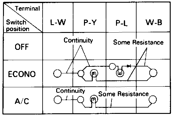 4. Using an ohmmeter, check continuity between the terminals for each switch position shown in the table.