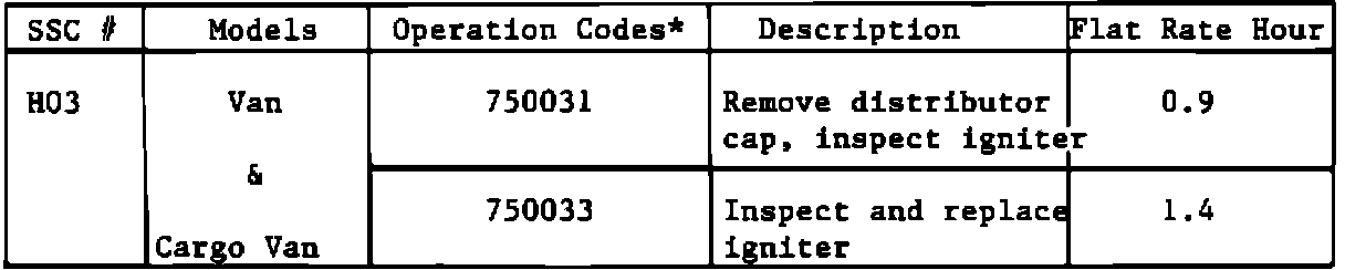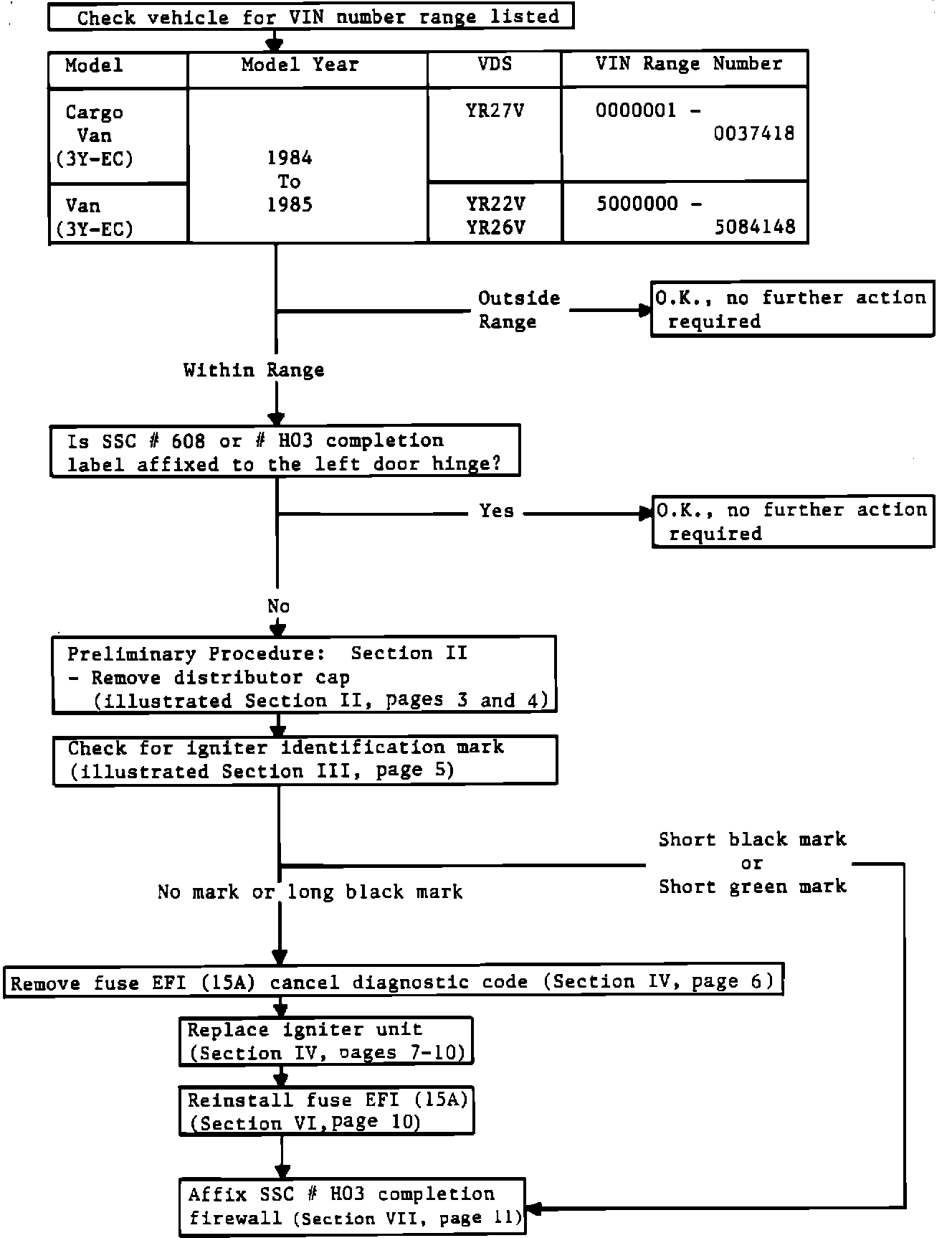 Instructions for inspection and, if necessary, replacement of the igniter assembly on 1984/1985 Van & Cargo Van models are explained in the following Sections I through IX.
