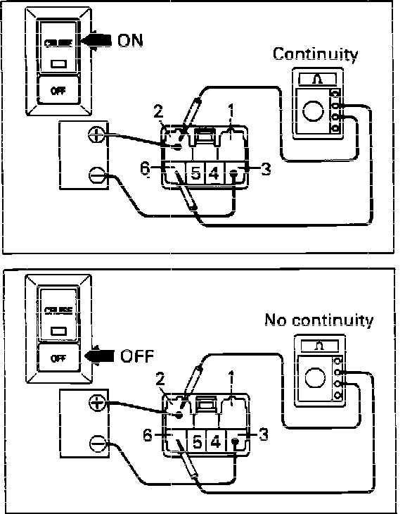 2. Check that there is continuity between terminals 2 and 6 with switch pushed "ON" and no continuity with switch pushed "OFF."