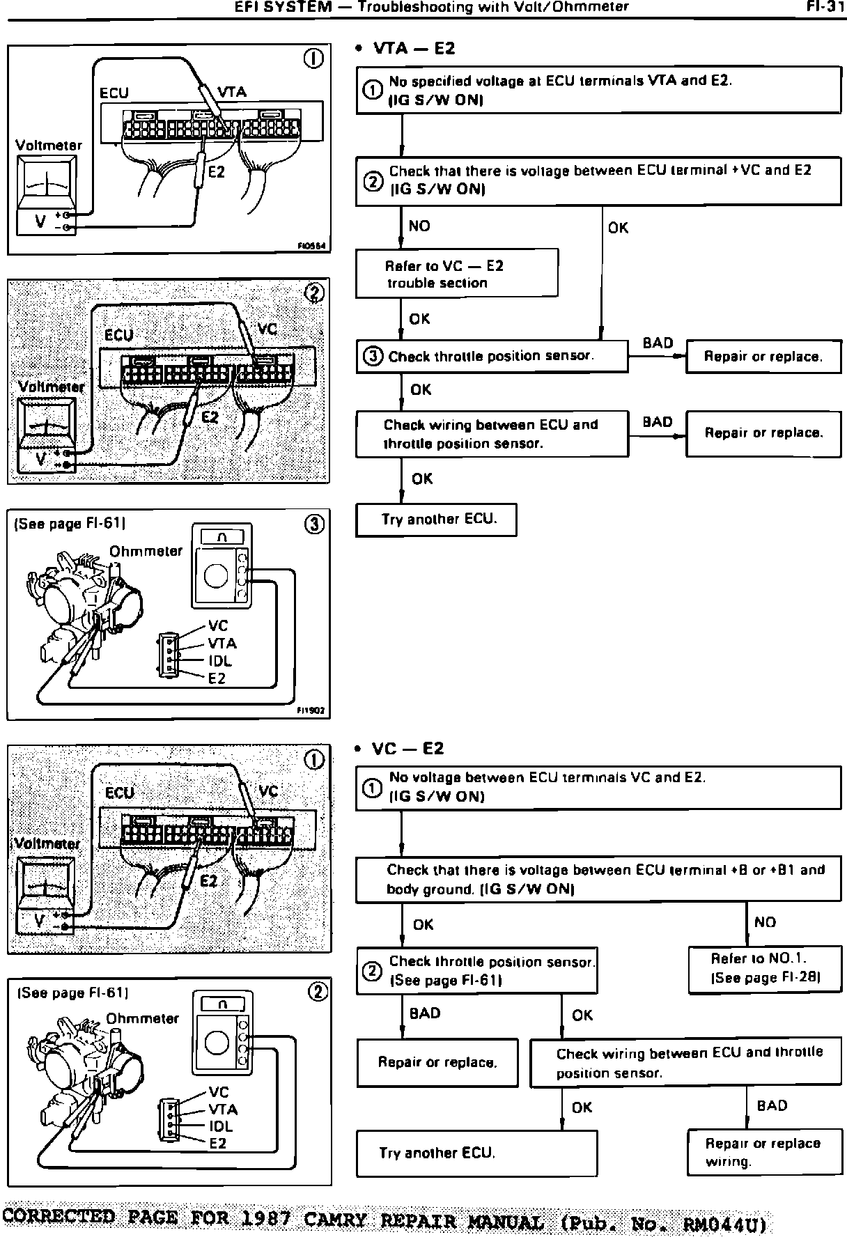 These pages are revisions of the EFI SYSTEM - Troubleshooting with Volt/ohmmeter section of the 1987 and 1988 Camry Repair Manuals. Please adhere the provided sticker to your copy of the indicated publications. The information on the sticker will direct you in the future to the revised information in the service bulletin.