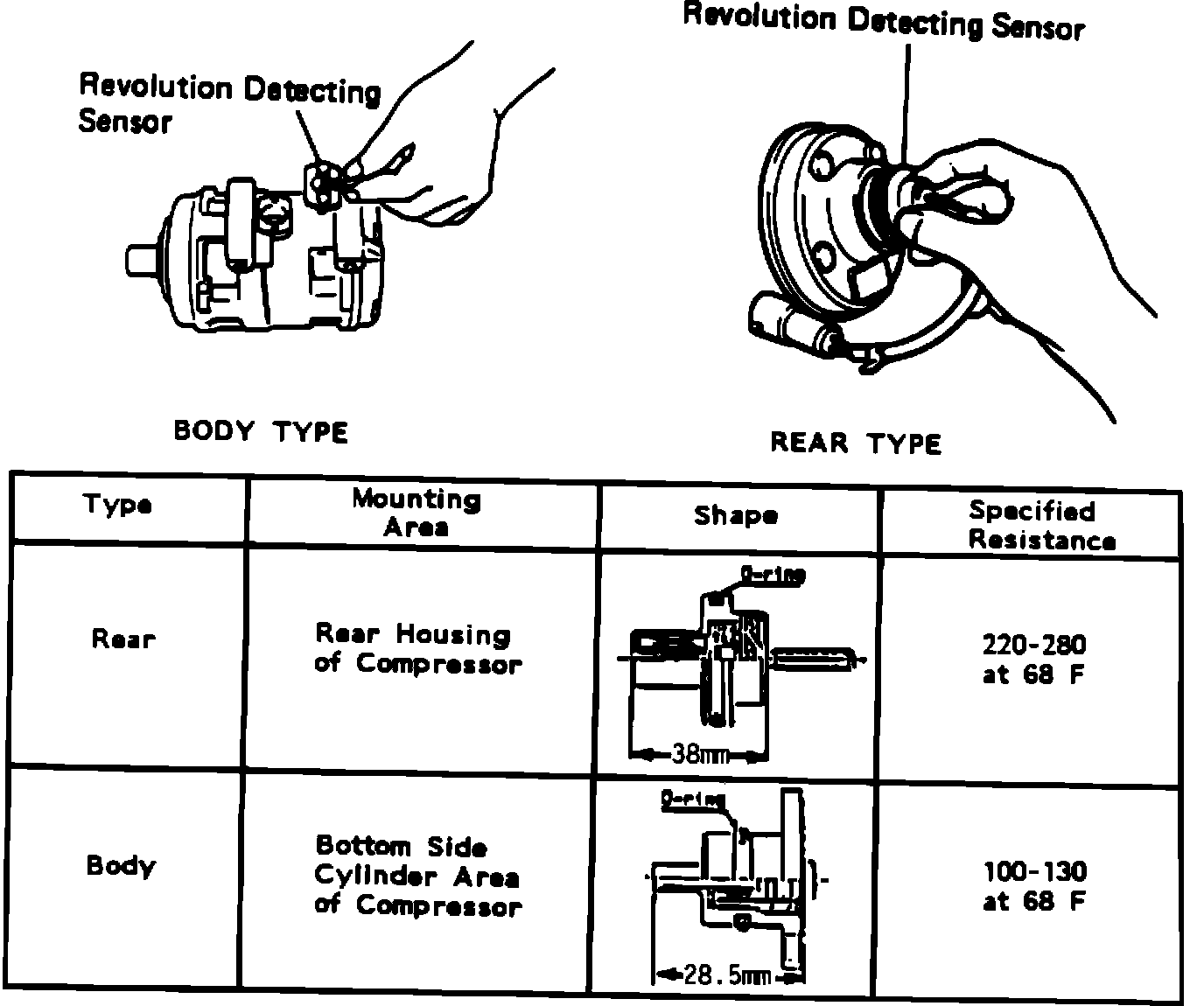 There are two different types of rotation sensors used on our A/C compressors (body mounted type and rear mounted type).