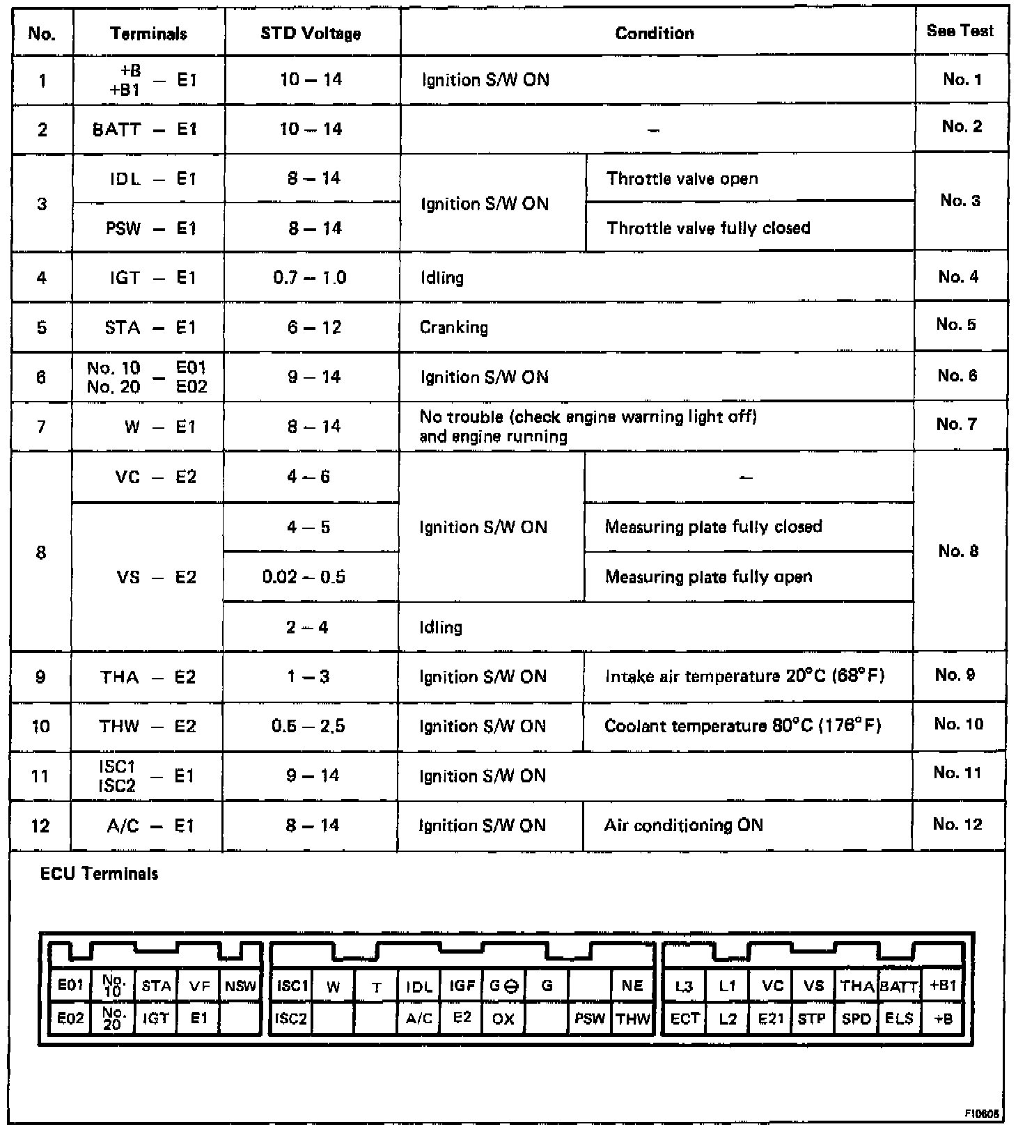 Using a voltmeter with high impedance (10 k ohms/V minimum), measure the voltage at each terminal of the wiring connectors.