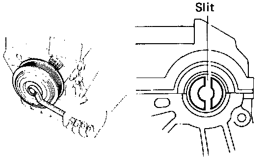 - Turn the crankshaft clockwise, and position the slit on the intake camshaft as shown.
