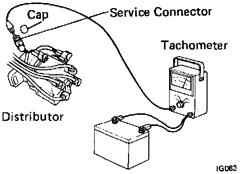 - Connect the test probe of a tachometer to the service connector of the distributor.