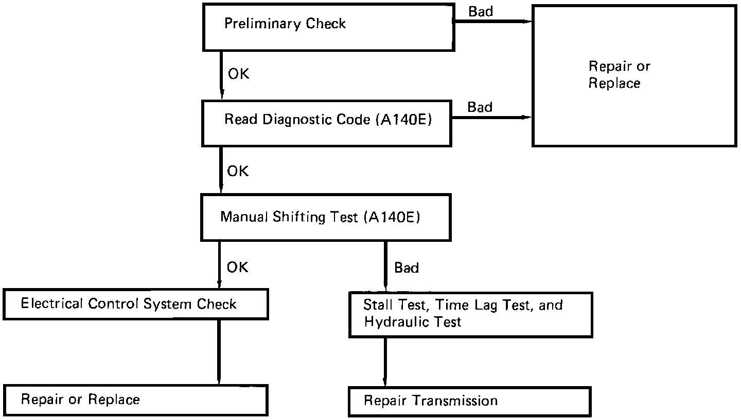 Trouble occurring in the ECT can stem from one of three sources: the engine, the ECT electronic control unit or the transaxle itself. Before troubleshooting, determine in which these three sources the problem lies, and begin troubleshooting with the simplest operation, gradually working up in order of difficulty.