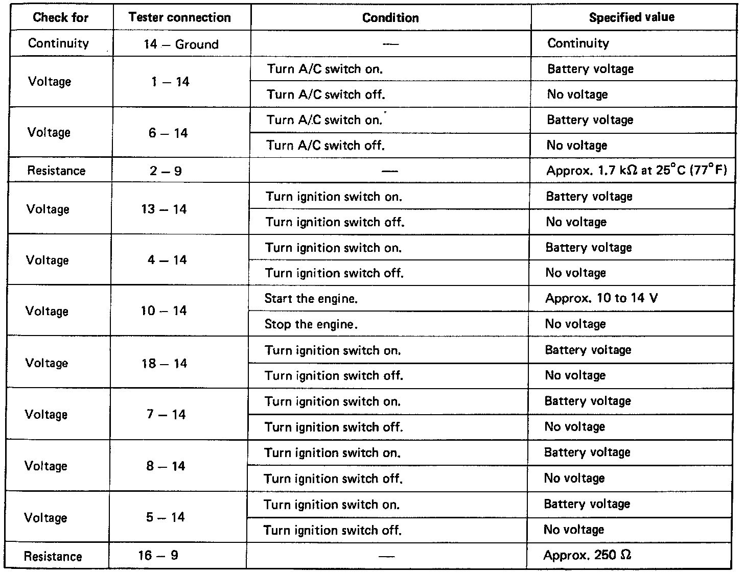 Disconnect the amplifier and inspect the connector on the wire harness side as shown in the chart.