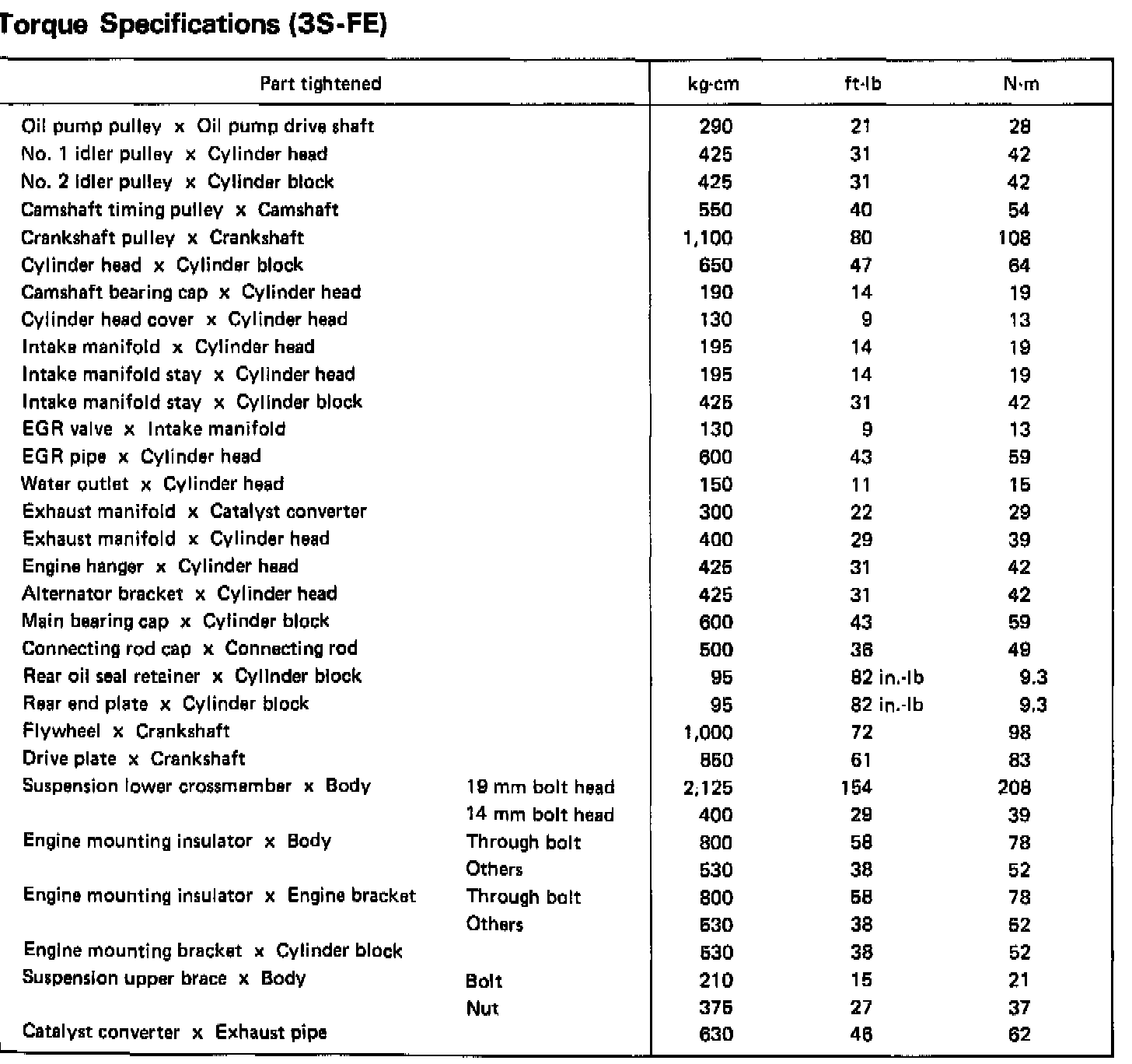 Upper Engine Torque Values 3S-FE: