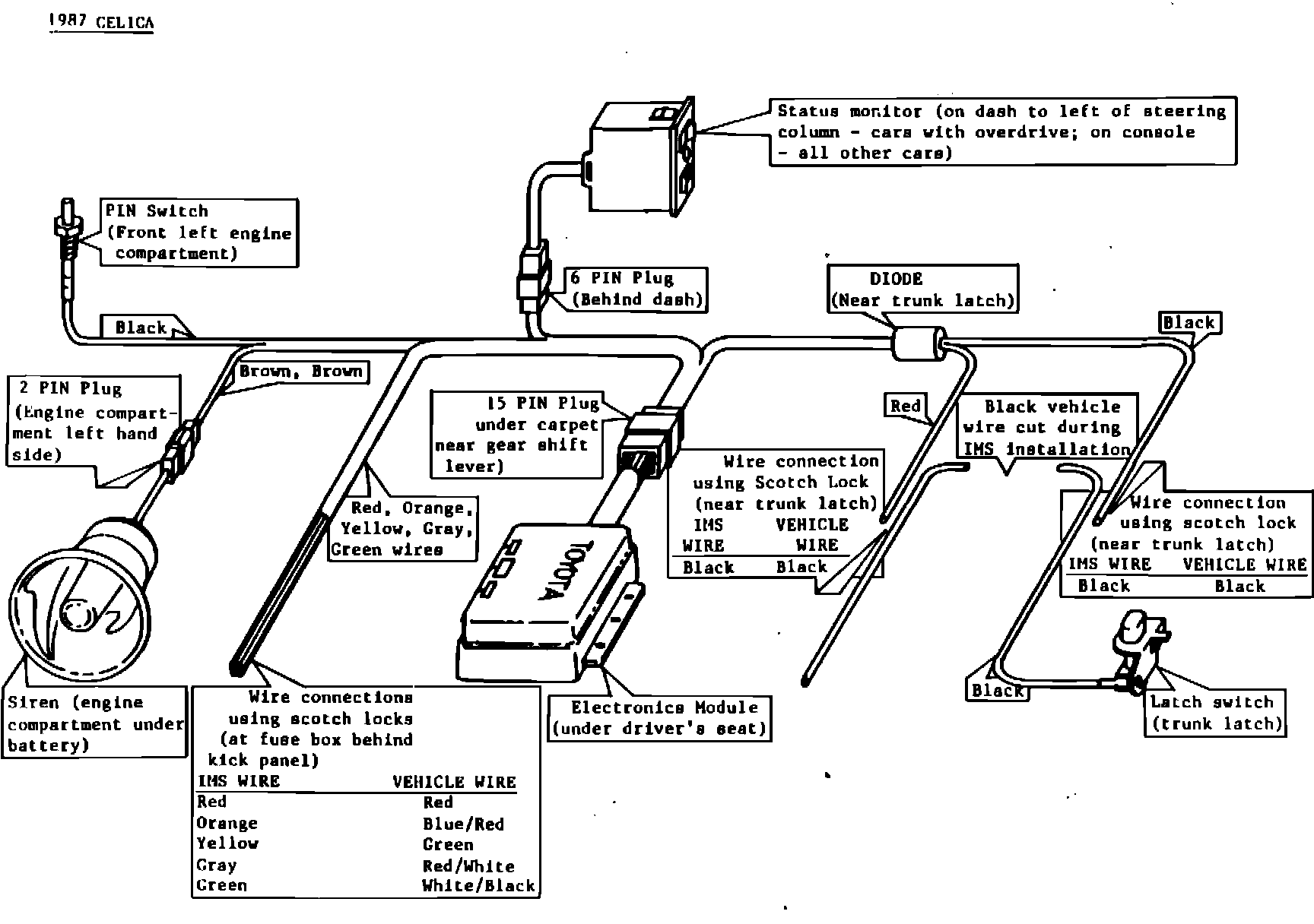The enclosed drawings are schematic representations of the Toyota Intrusion Monitoring System (IMS) as it is installed in the various 1987 Toyota vehicles. The following 1987 vehicles are referenced by the drawings:
