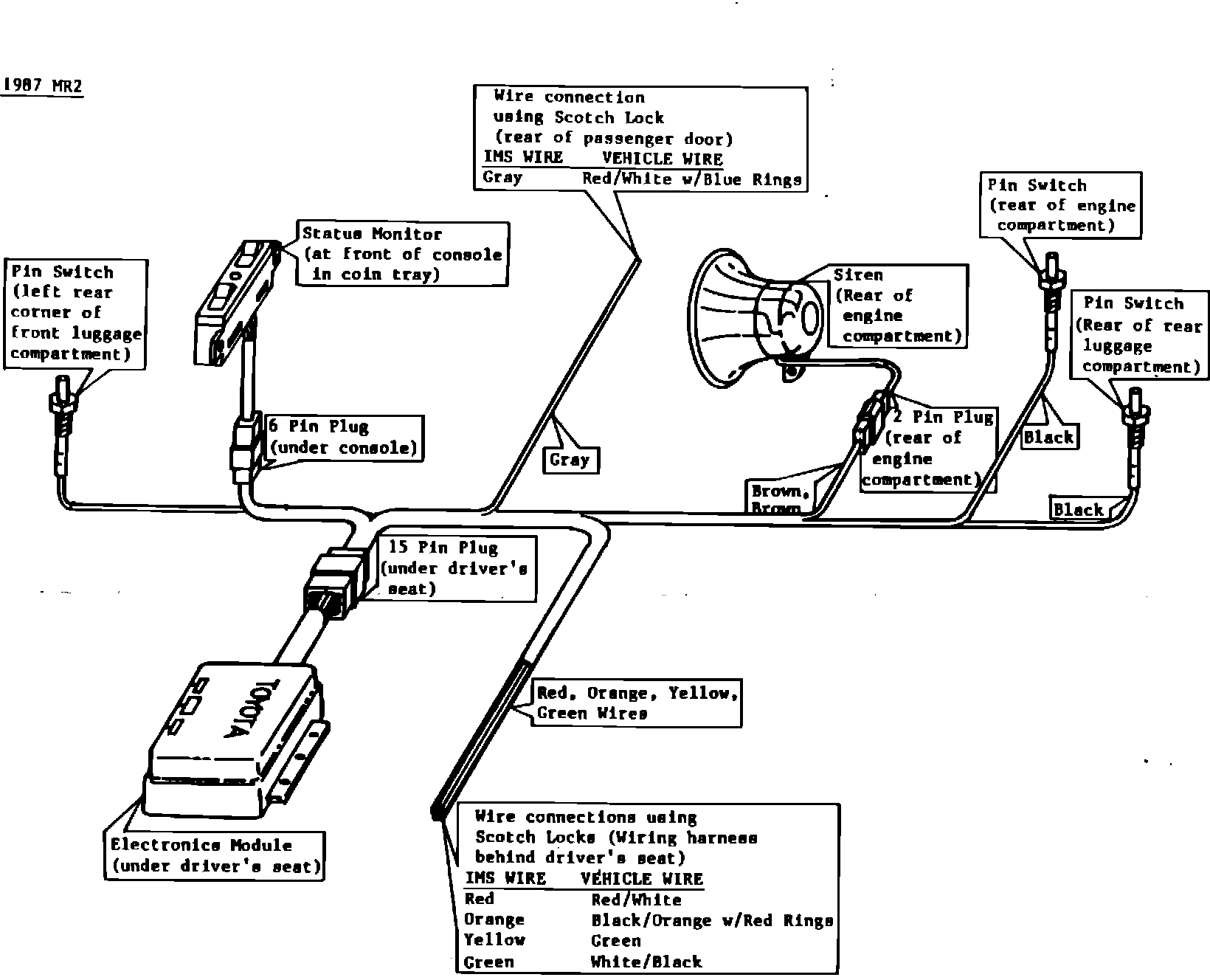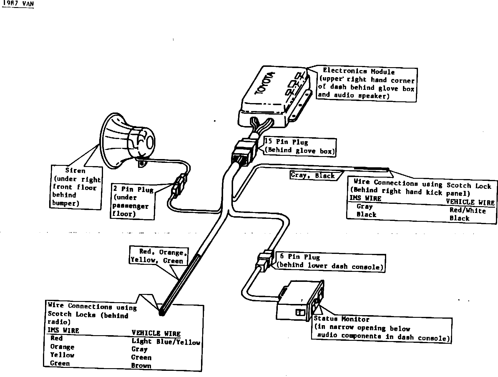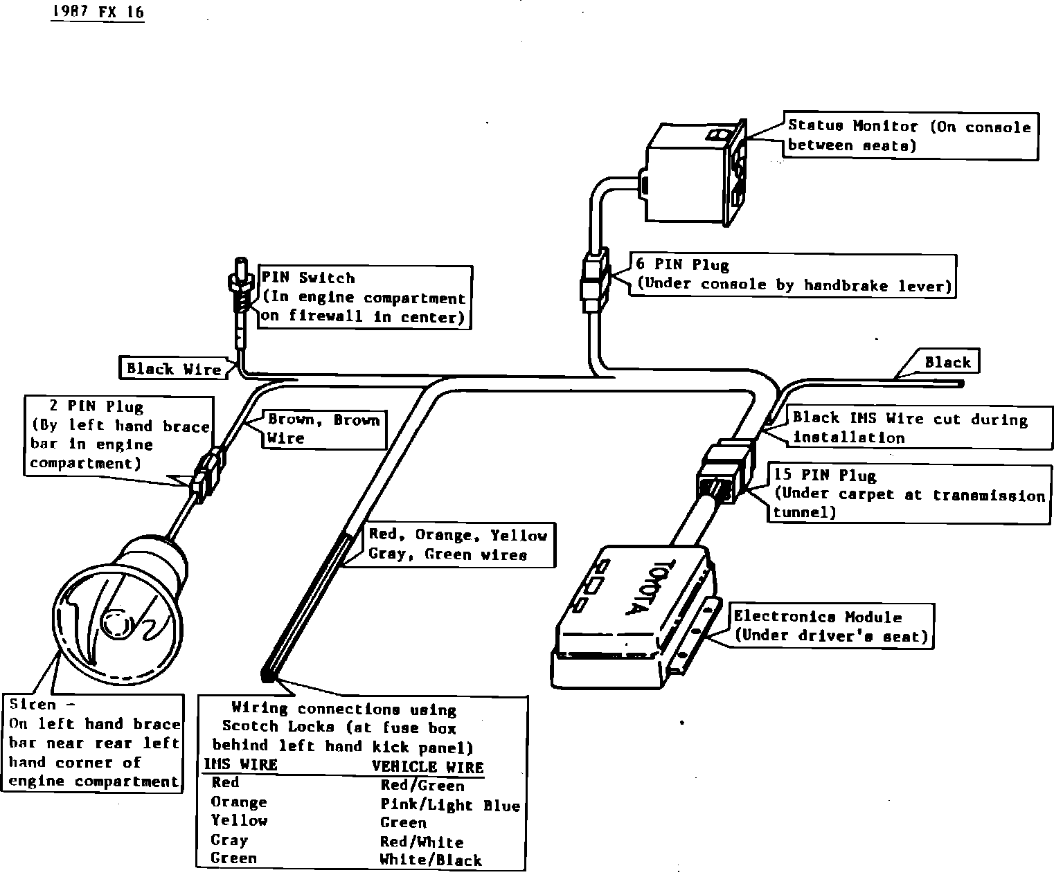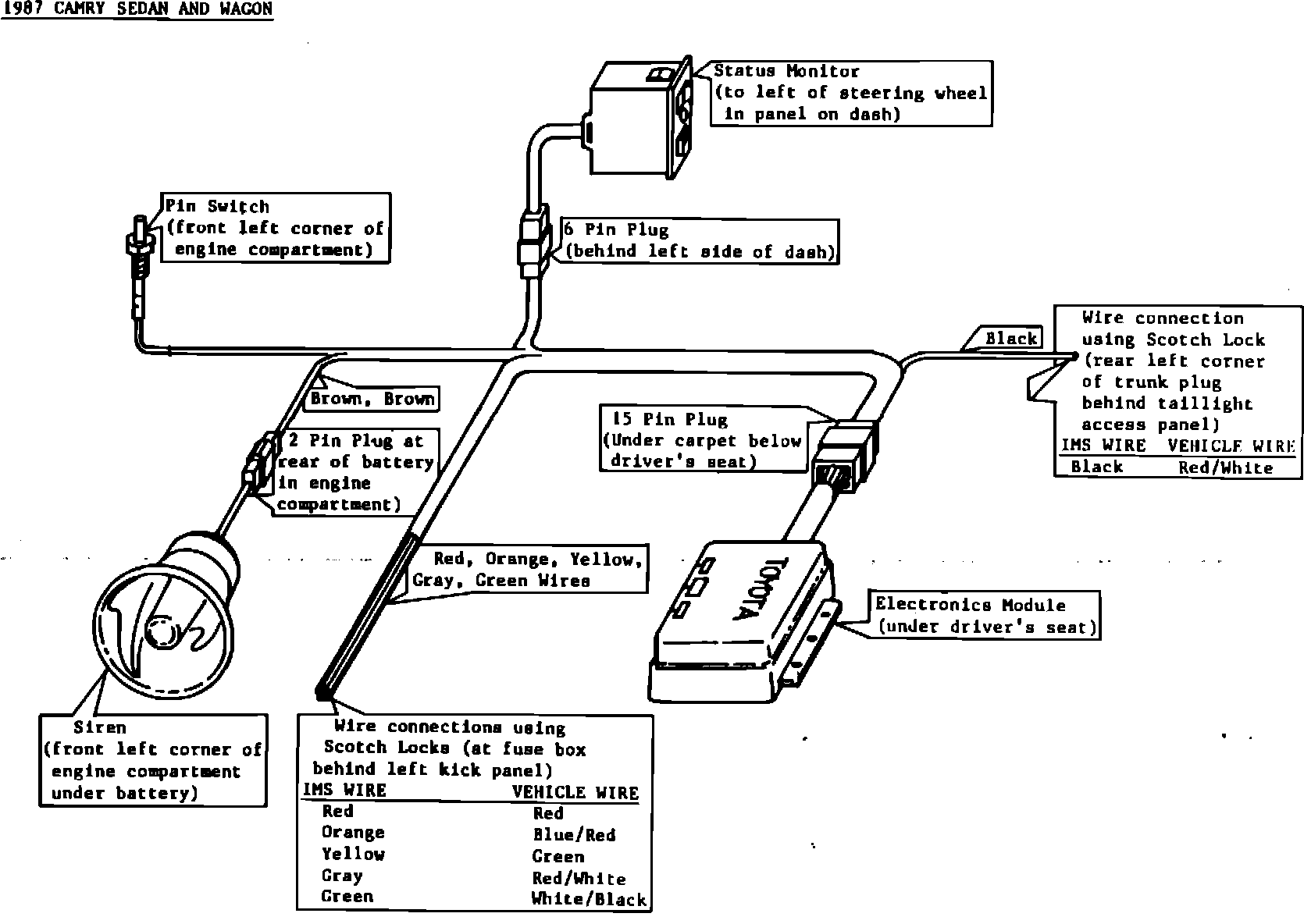 The components are shown in their approximate relative positions and are identified by component name and location in the vehicle. The drawings are not to scale. Where wire connections exist between the IMS System and the vehicle wiring, wire colors on both sides of the kit Scotchlock Connections are indicated. The functions of the various IMS System wires are described completely and in detail in Toyota Service Bulletin, Volume VIII, Number 008, issued December 2, 1985. Please refer to this Bulletin for further details. Briefly, the functions are as follows: