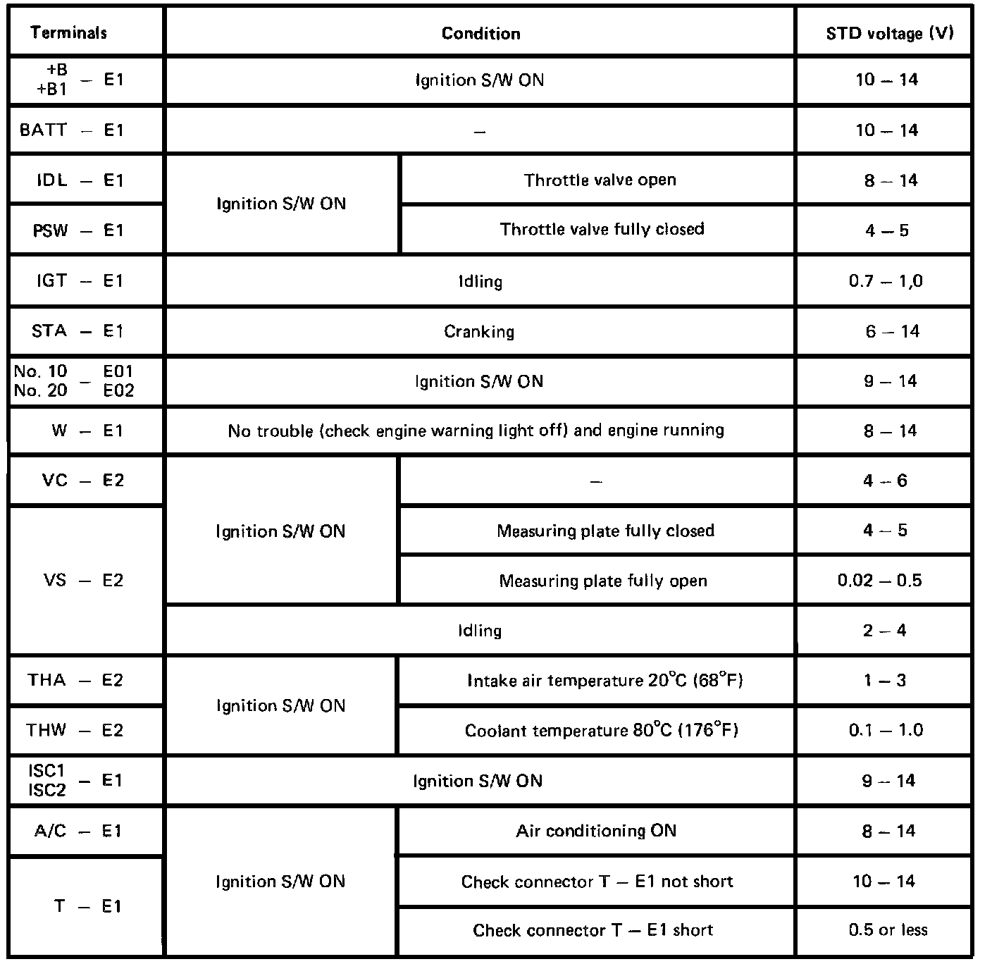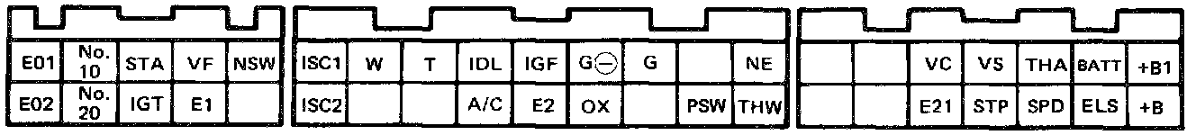 NOTE: The EFI circuit can be checked by measuring the and voltage at the wiring connectors of the ECU. Check the voltage between each terminal of the wiring connectors.