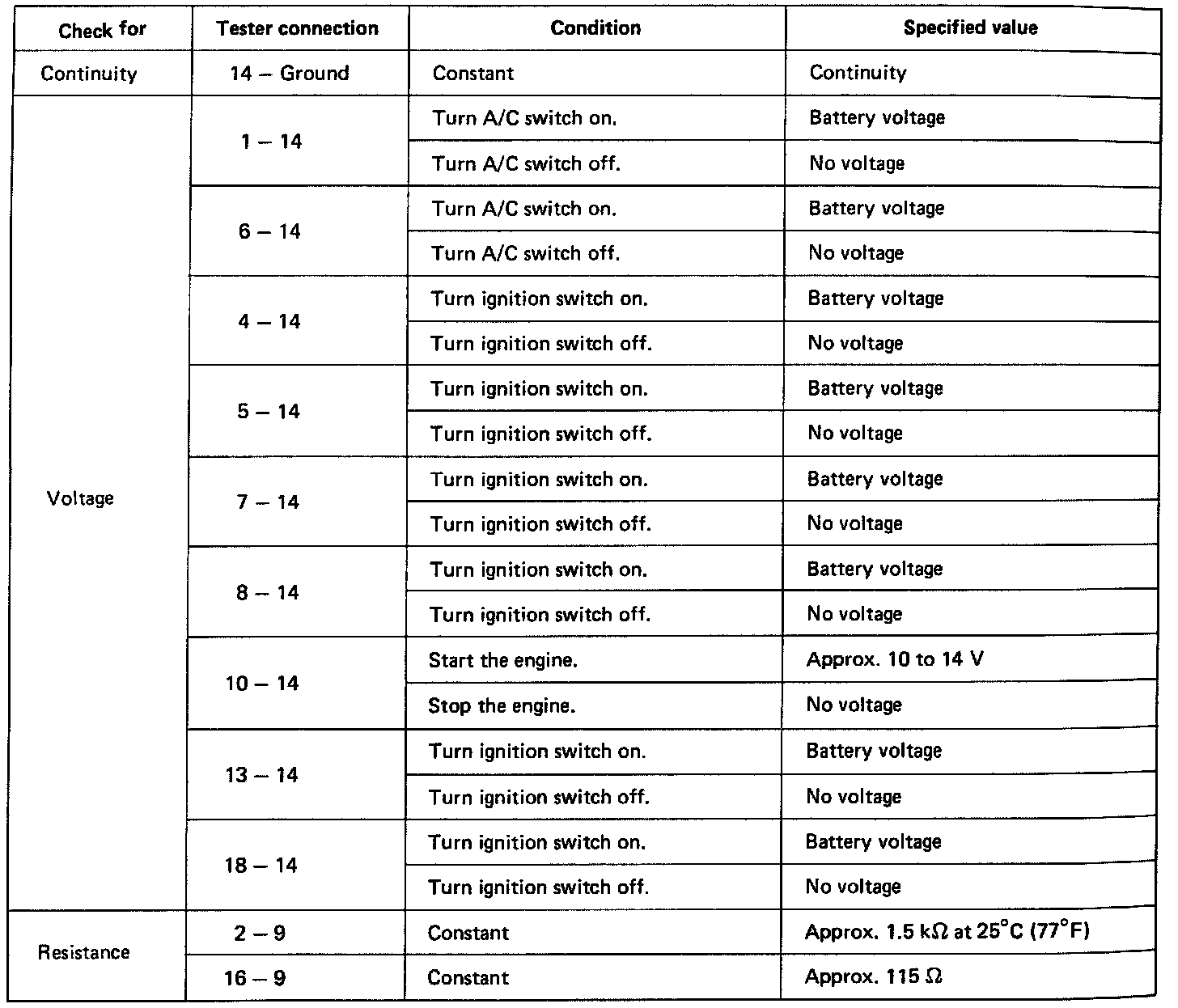 Disconnect the amplifier and inspect the connector on the wire harness side as shown in the chart.